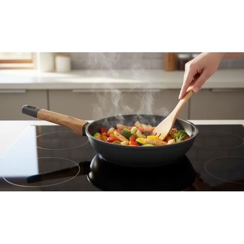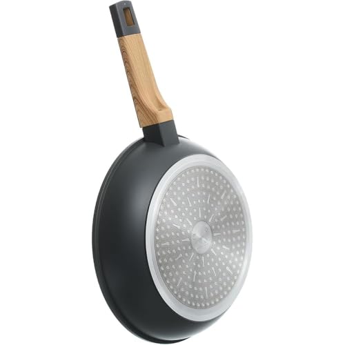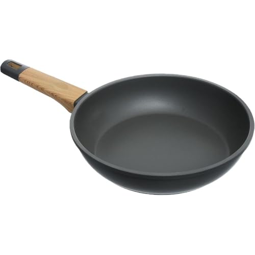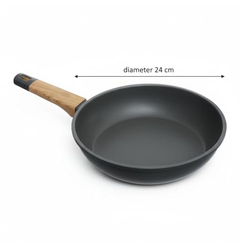 Generic - Nonstick Deep Frying Pan with Induction Base & Wooden Handle, Fast & Even Heating, Easy-Clean Aluminium Skillet, Works on All Hobs, Black (24 Cm)