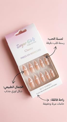 - شكل لوزي طبيعي: تأتي الأظافر بقصة لوزية (Almond Shape) انسيابية، تمنح الأصابع طولاً ومظهراً رشيقاً، وتعتبر القصة الأنسب لإظهار تفاصيل رسمة القلب بوضوح وأناقة.