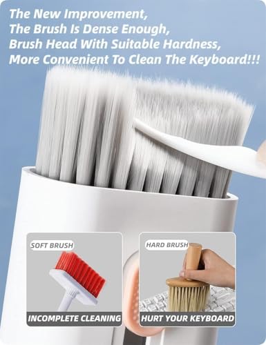 - High density soft brush:The keyboard brush is chosen for its moderate hardness and high pore strength. Thanks to the three-row design, the brush ensures high friction and flexibility, making it easy to vacualize dust from keyboard gaps without scratching the keyboard covers or the surface of the device.