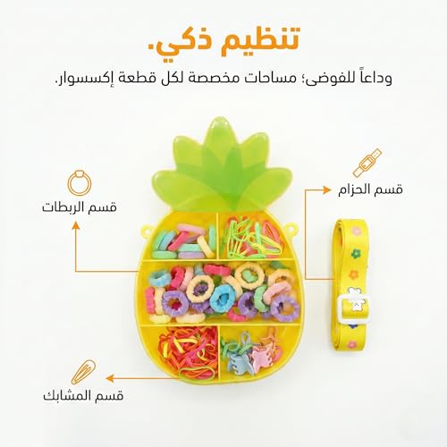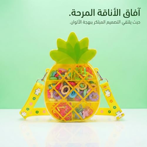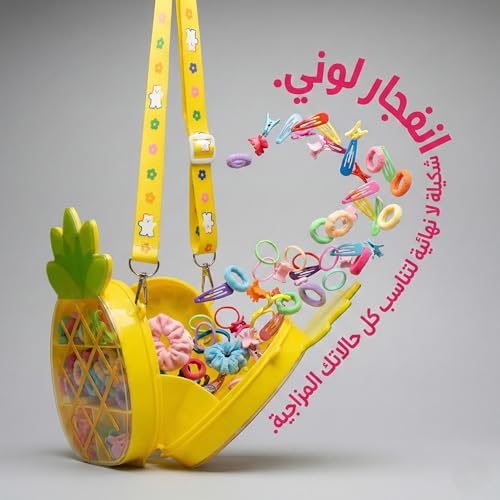 - تصميم حقيبة الأناناس المبتكر: تأتي مجموعة إكسسوارات الشعر في حقيبة فريدة وجذابة على شكل ثمرة أناناس، مما يجعلها قطعة زينة مميزة وسهلة الحمل بفضل حزام الكتف المرفق القابل للتعديل.