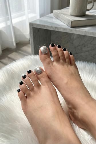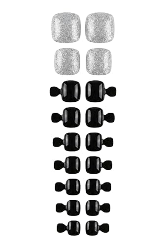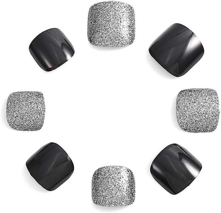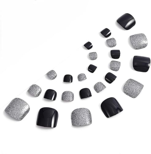 Nopatia - False Toenails 24 Pcs, Glossy Black and Silver Glitter, Full Cover Easy to Apply Nail Tips for Home Pedicure Premium Fake Toenails Set for Women and Girls
