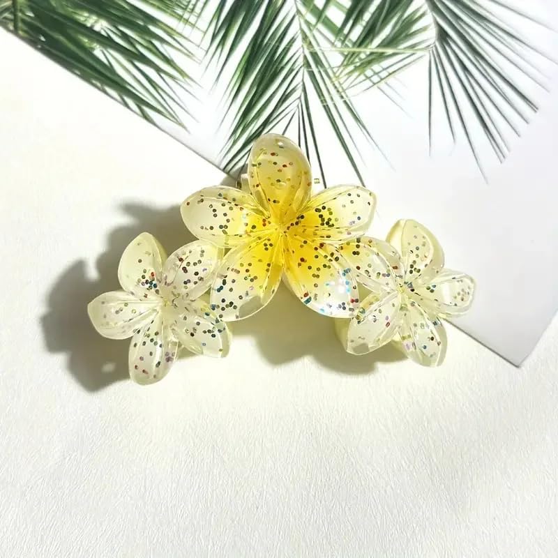 Nopatia - مشبك شعر مخلب من Nopatia بتصميم 3 زهور متصلة مع جليتر لامع، توك شعر اكريليك شفافة بلمسة براقة. مشابك بتصميم هاواي (Plumeria) للصيف والشاطئ، تثبيت قوي وأنيق للشعر (Lemon yellow)