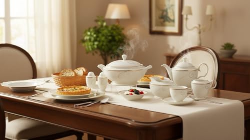 - 3 oval service and 2 soup serving bowls with lid and 1 Teapot with lid and 1 sugar with lid