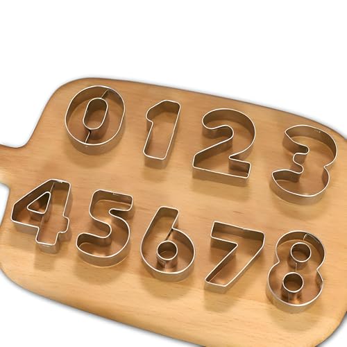 - This set includes 9 stainless steel cookie cutters featuring the numbers 0, 1, 2, 3, 4, 5, 6, 7, and 8. The 6 cutter can also be used to create the number 9, allowing for versatile number-themed baking projects. Each cutter measures approximately 8 x 5 cm, perfect for a variety of baking purposes.
