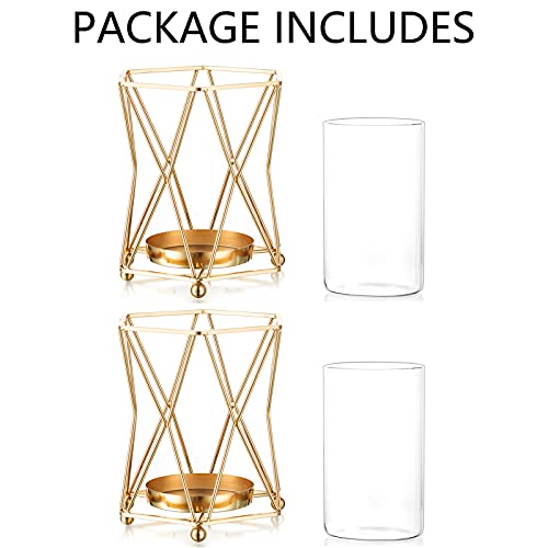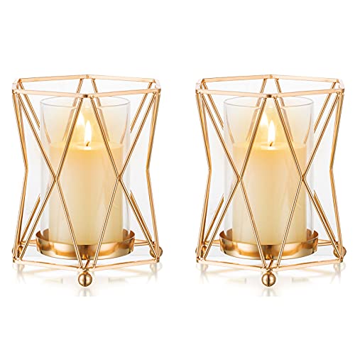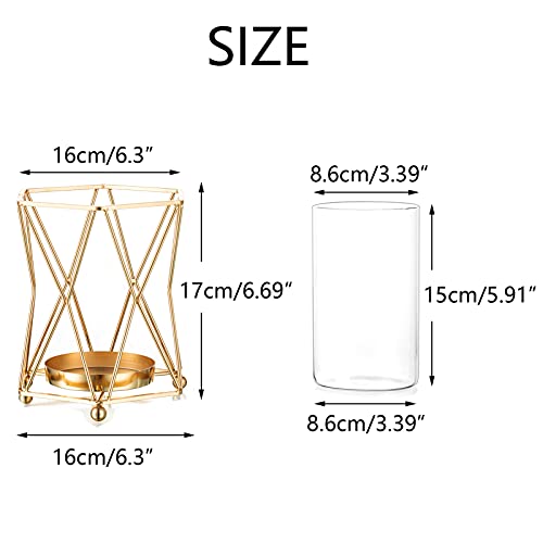 Nuptio - NUPTIO 2 Pcs Pillar Candle Holder Geometric Glass Flower Vase Metal Holder, Glass Hurricane Candle Holders for Bathroom Dining Table Decoration, Gold Candle Holders Gifts for Mum