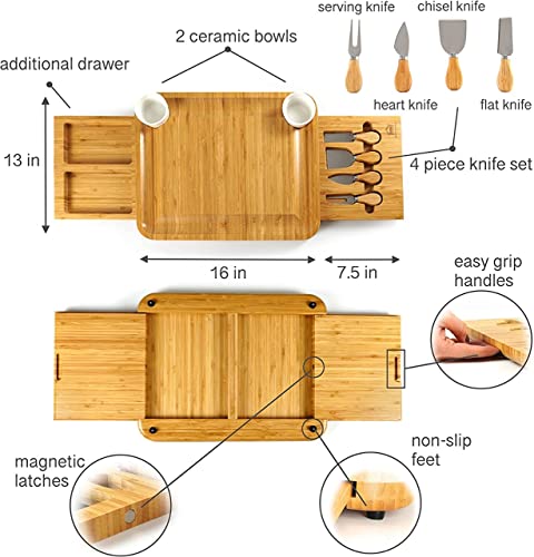 - Full Serving Accessories: This Bamboo Cheese Board Set includes 2 ceramic bowls, 3 serving knives and 1 serving fork. There are 2 hidden slide-out drawers on both sides of the board. One side is used to place the serving utensils while the other can be used for nuts, seeds or other foods.