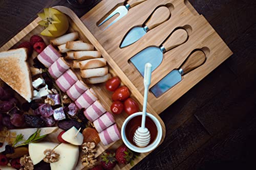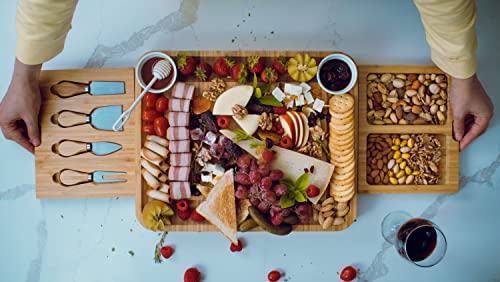 NUSNOS - Extra Large Cheese Board and Knife Set - Bamboo Charcuterie Board Meat Charcuttery Platter Serving Tray