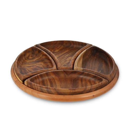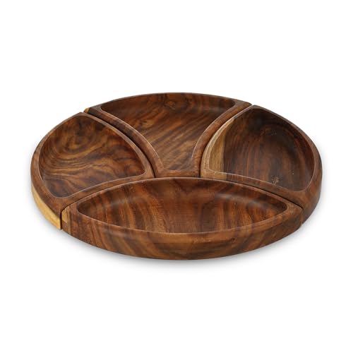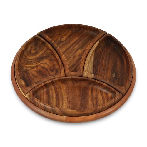 - HANDCRAFTED DESIGN: Beautiful round wooden serving plate featuring 4 elegantly carved compartments with wavy patterns, perfect for serving nuts, snacks and appetisers