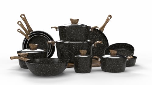 Nuvira - 17-Piece Granite Cookware Set, Pots, Pans, Trays, Milk Pan, Wok, Crepe Pan (18/20/24/28cm Pots, 20/24/28cm Pans, 26/30cm Trays, 16cm Milk, 28cm Wok, 32cm Crepe) - BLACK