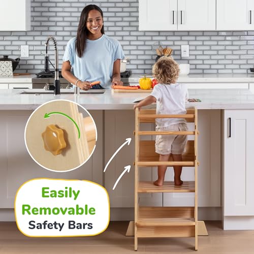 - PEACE OF MIND Extra safety at the back, to ensure your child can't step out. A safety rail, secured with screws at all time and two easily removable safety bars with knob screws at the end. Slipping won't be a problem either as the learning tower comes with 6 anti-slip strips.