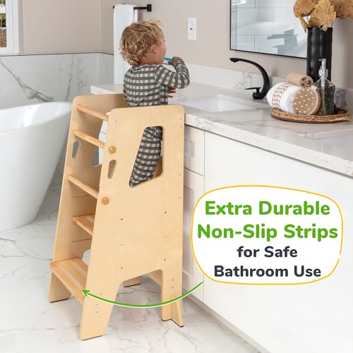 - UNIQUE & SMART DESIGN The slim sturdy structure in natural color and pine wood will definitely look good in your home. Doesn't take up much space while also creating a safe place for your child. Your new montessori learning tower won't scratch or slide on your floor, due to the 4 non-slip pads.