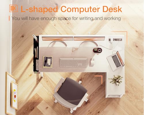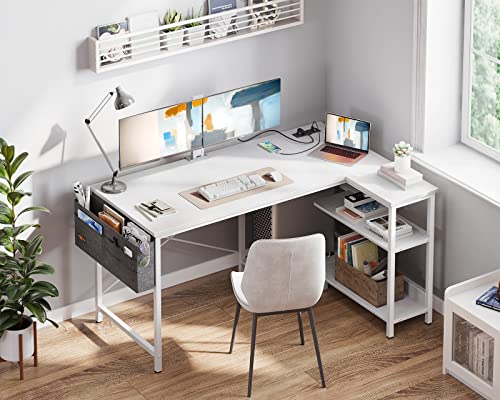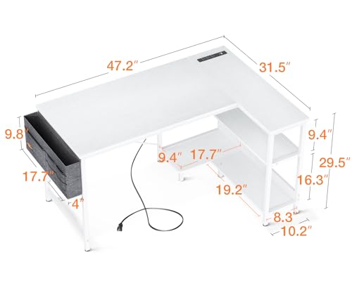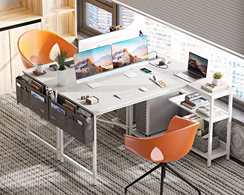 ODK - مكتب كمبيوتر ألعاب صغير على شكل L مع منافذ طاقة وأرفف تخزين قابلة للعكس وحامل كمبيوتر للمكتب المنزلي وطاولة دراسة وكتابة بسيطة مع شنطة تخزين للمساحات الصغيرة من او دي كيه، لون أبيض، مقاس 1.22 متر