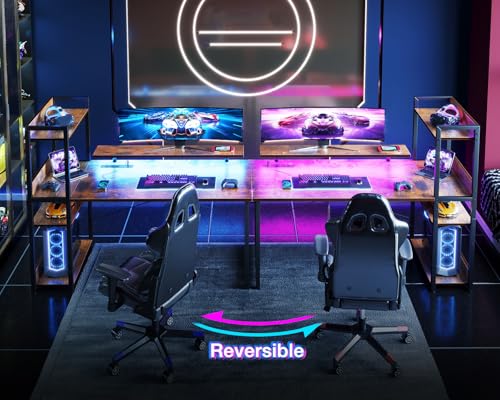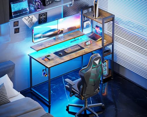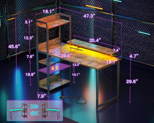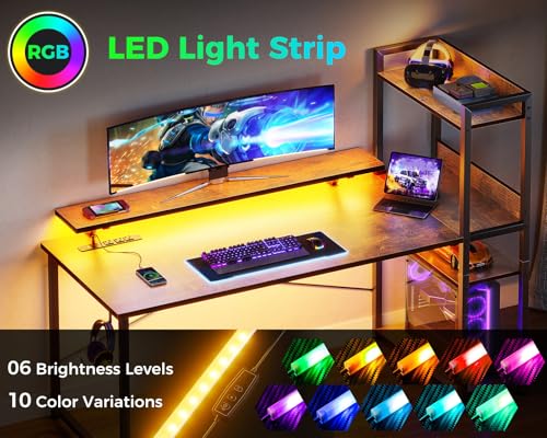 ODK - ODK Reversible Computer Desk with Power Outlets & USB Charging Port, 48 Inch Gaming with Storage Shelves and Monitor Stand, Modern Writing Study Desk for Small Space Bedroom, Rustic Brown