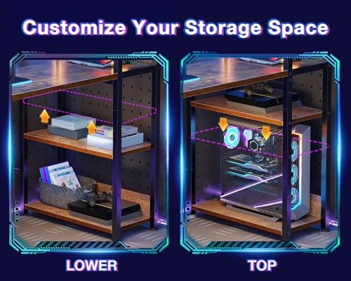 - 【Gaming Desk with Colorful LED Lights】This gaming table features LED strip that contains 10 static colors, 6 brightness grades, 10 dynamic modes and memory function with switching controls. Adjusting to the proper lighting can reduce eye strain, improve focus, and create a comfortable workspace/gaming space.