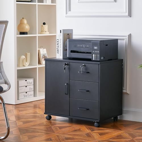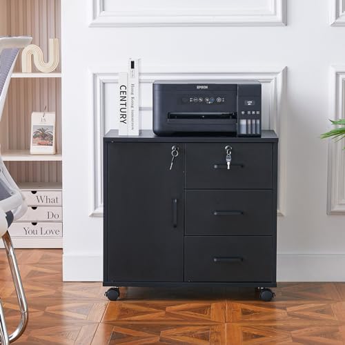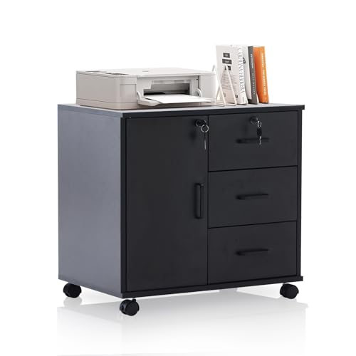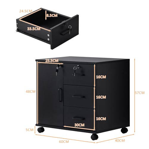 OFCASA - اوفكاسا خزانة ملفات متحركة مع 3 ادراج وباب واحد مكتب قابلة للقفل عجلات تخزين دوارة من الخشب الاسود للمنزل والمكتب 40 × 60 سم