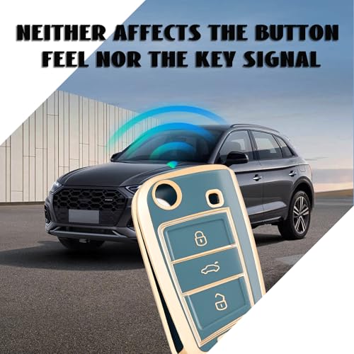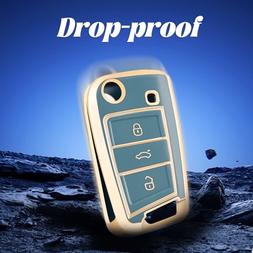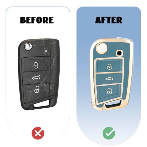 OFF WE GO - Car Key Cover for VW Volkswagen Golf 7 Mk7 Polo Skoda Superb Seat Ibiza Tiguan T-Roc Leon Skoda Octavia, TPU Car Key Protective Cover 3 Button Flip Key Fob Case - Blue Gold
