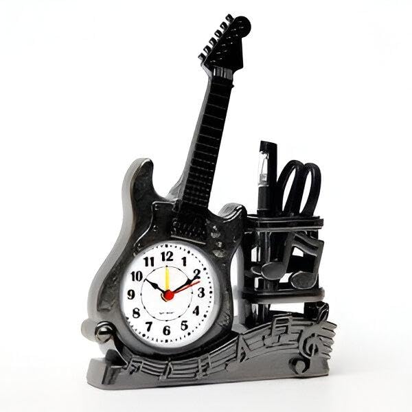 - تعمل الساعة بتصميم الجيتار المصغر كقطعة زخرفية يمكن وضعها على أرفف الكتب أو المكاتب أو أي مساحة مناسبة، مما يجعله إضافة لافتة للنظر لبيئات المنزل أو المكتب، مما يضيف لمسة من الإبداع.