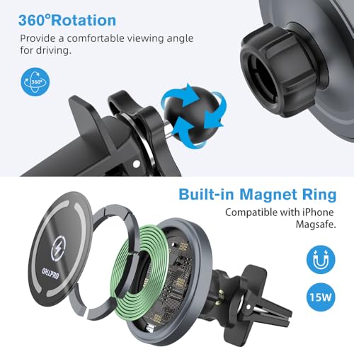 OHLPRO - OHLPRO for MagSafe Car Mount Charger iPhone Wireless Car Charger, Stick on Dashboard Magnetic Phone Holder Mount for iPhone 17 Pro Plus Max 16 15 14 13 12 Series, 15W Fast Charging, Aluminum Shell