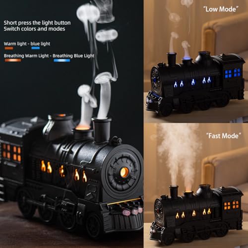 - - Realistic and coolest small train shape essential oil diffuser humidifier for any train lover. It is made very detailed and well designed. There are two speed options for the diffusing dispersion operation: low and fast. You can pick three lighting options: none, warm and blue.