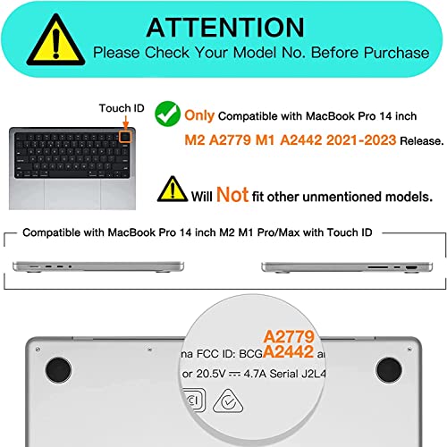 - Designed ONLY to be compatible with MacBook Pro 14 inch 2023 2022 2021 Release M2 / M1 Pro / Max with Liquid Retina XDR Display & Touch ID (models: A2779 & A2442 - MPHE3LL/A, MPHF3LL/A, MPHG3LL/A, MPHH3LL/A, MPHJ3LL/A, MPHK3LL/A, MKGP3LL/A, MKGQ3LL/A, MKGR3LL/A, MKGT3LL/A).