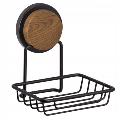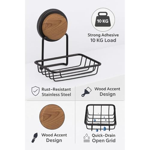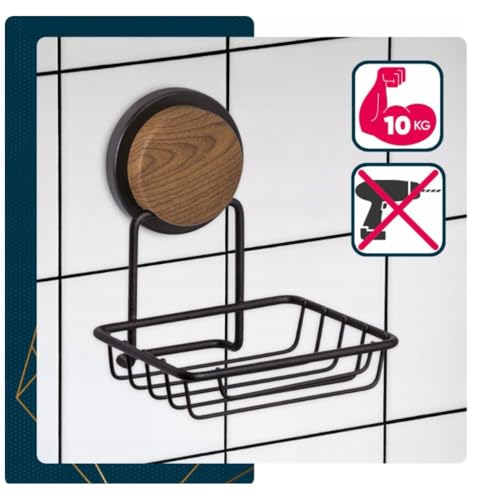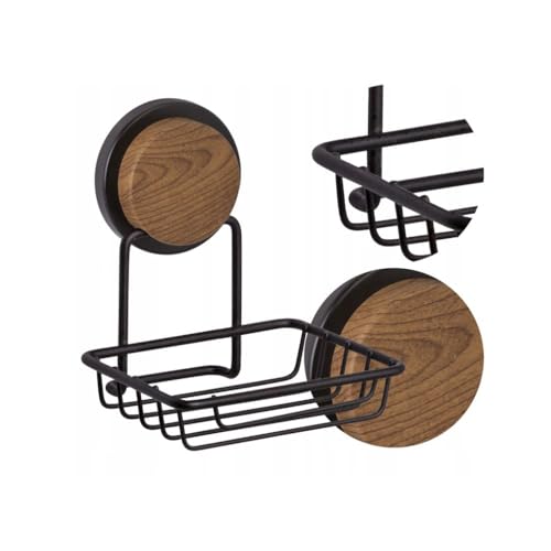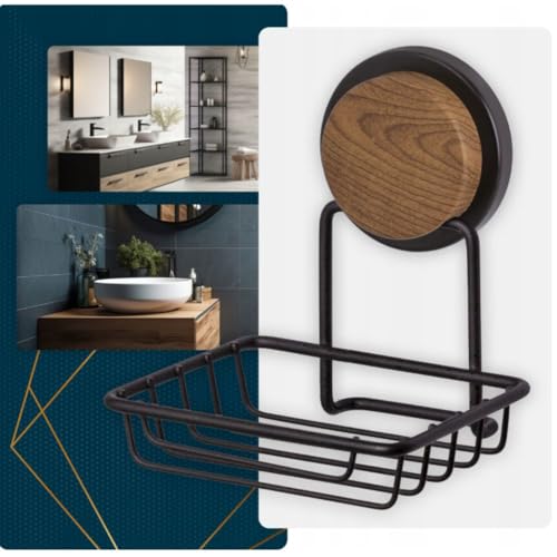 Generic - Okunyas No-Drill Soap Dish Holder – Adhesive Wall-Mounted, Wood Accent & Stainless Steel Frame, Rust-Resistant, 10 kg Load, 11.5L × 13W × 14H cm, Black