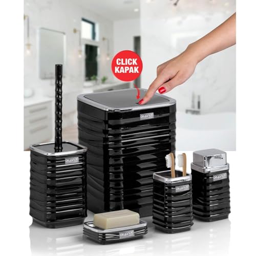 - (Comprehensive Bathroom Set): The Luna Square 5 PCS Bathroom Set is a complete solution for organizing your bathroom essentials. It includes a soap dish, soap dispenser, trash can, toilet brush, and holder, as well as a toothbrush holder. This set provides everything you need for a clean and clutterless bathroom