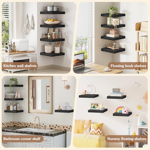 Olakee - Olakee Corner Floating Shelf Set of 4, 9.84’’ Rustic Wood Wall Mounted Corner Shelf for Bathroom, Bedroom, Kitchen, Living Room, Farmhouse, Office-Heavy Duty Floating Shelves – Black