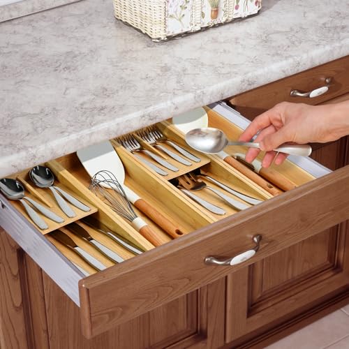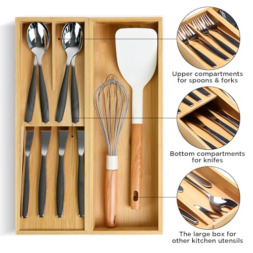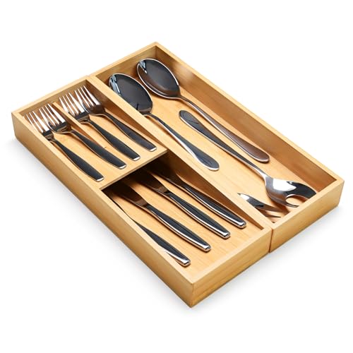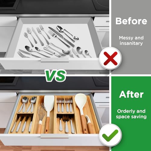 - CLEAN & TIDY: The bamboo silverware organizer comes with 4 different areas for forks, spoons, knives, whisks, ice cream scoops, and any other kitchen gadgets(silverware, utensil, cutlery, flatware) you want organized. The bamboo utensil organizers are perfect solution for organizing your messy drawers. Keep your kitchen drawers more neat amd organized. Making it easy to find what you're looking for.