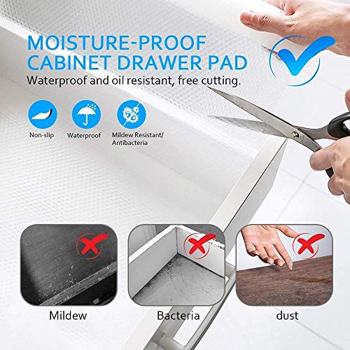 - 🤍 MULTIFUNCTIONAL SHELF LINER- The liner size: 60 x 300 cm. It can be easyily cut to any size and shape to fit your cabinet, drawer, refrigerator or shelf or as placemat and coaster. Use the cabinet liner in your kitchen, pantry, work station, laundry room, cupboard, table, shelves, counter top, office space and more.