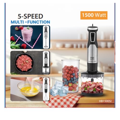 One Life - One Life Hand Blender HB1500SI -1500W 5 Speed Stainless Bearing 4 Blades + 600ml Bowl + Choper 500ml + Stainless Steel Whisk