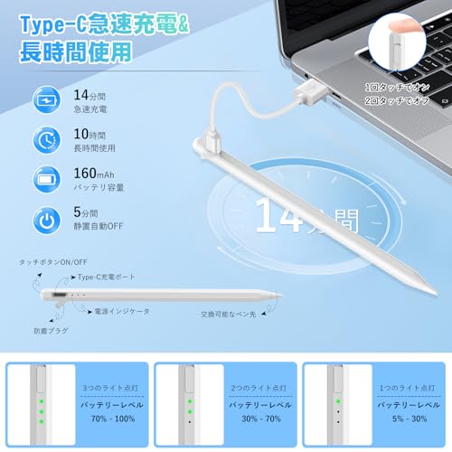 - Type C Fast Charging & Long Time Use: The stylus is equipped with Type-C super fast charging technology, which takes only 14 minutes and can be used continuously for 10 hours of use. Automatically enters sleep mode after 5 minutes in stationary state, preventing forgetting shutdown, saving battery. Built-in indicator light allows you to easily check remaining battery level in any situation and eliminate the worry of battery life. (One light on:Battery level 5%-30%, 2 lights light:Battery level 30%-70%, 3 light on:Battery level 70%-100%) Enjoy the rapid charging of the stylus pen and long battery life. Never worry about running out of battery!