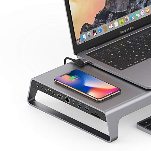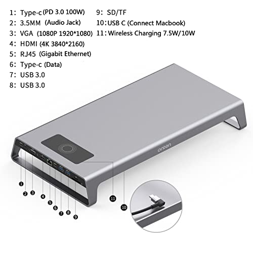 ONTEN - ONTEN 11 in 1 USB C Docking Station,Laptop Aluminium Item Stand with Wireless Charging 2*USB3.0, Gigabit Ethernet Power Delivery 100W, TF/SD Card Reader Compatible with MacBook Pro/Air and More
