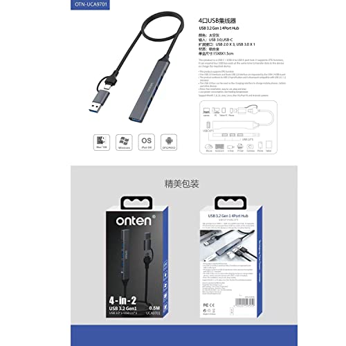 ONTEN - ONTEN USB C Hub With 1.6ft Cable, 4 Ports 3.0/2.0 Adapter for MacBook Pro, iMac 2021 - Aluminum Alloy Splitter, Color Gray