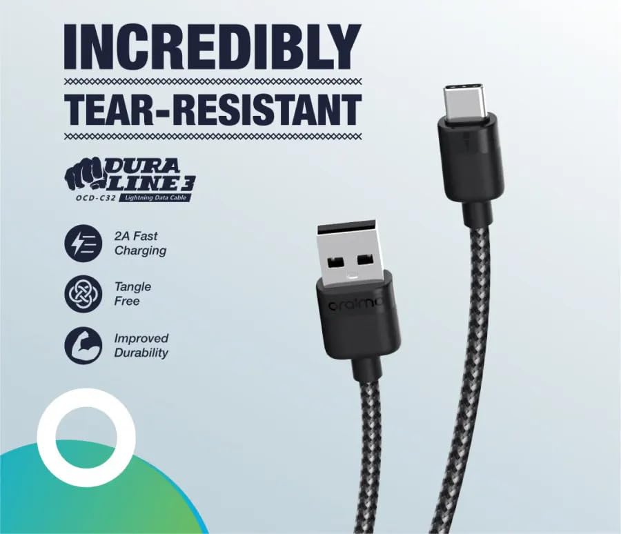 Oraimo - Oraimo DuraLine 3 (OCD-C32) USB-A to USB-C Charging/Data Cable, 1m, Anti-Tangle Braided Design, High-Tensile Nylon Material, USB 2.0, 480Mbps Data Transfer, Supports 5V/2.4A (12W) Fast Charging, Black
