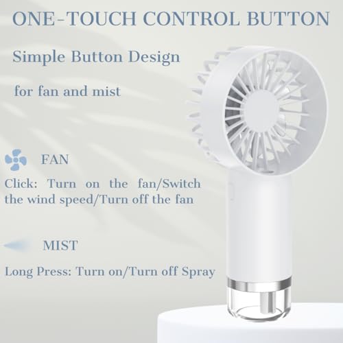 - 【ONE-TOUCH CONTROL BUTTON】- The button for the fan and mist button is the same. Press once for level one fan speed, press twice for level two fan speed, press three times for level three fan speed, and press four times to turn off the fan. Long press the button to activate misting; long press again to deactivate misting.When the fan is running, you can press and hold the button to turn on the spray at the same time. Similarly, if the spray is on, pressing the button will activate the fan.