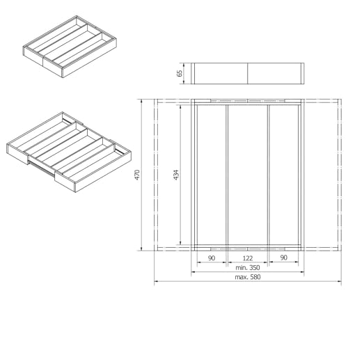 - ✅ ADJUSTABLE SIZE - ORGA BOX UNIVERSAL - Thanks to its adjustability, this cutlery tray is suitable for all types of drawers. The cutlery tray measures 350 x 470 x 65 mm when folded and 580 x 470 x 65 mm when unfolded. A perfect fit for drawers with a width of 400 - 600 mm and a depth of 473 mm (internal dimensions). Always measure your box before purchasing!