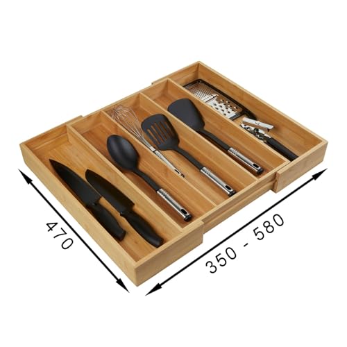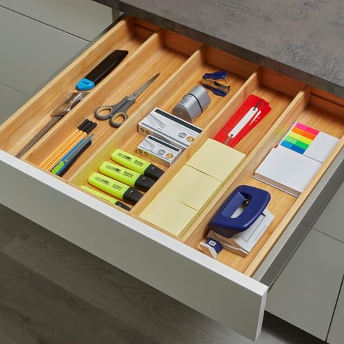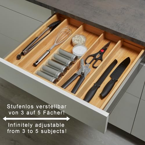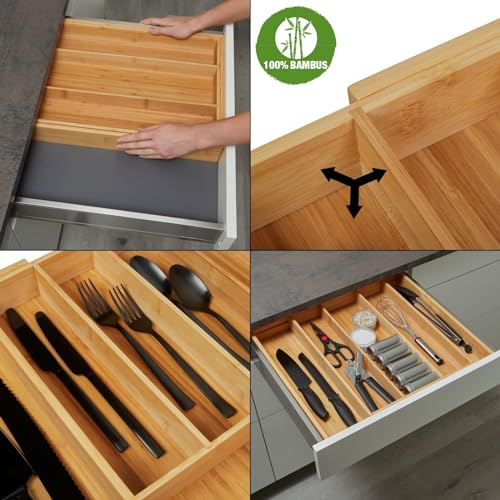 - ✅ ORGANIZATION - The numerous compartments make it the perfect organizational system for the kitchen, office and bedroom. Thanks to the pull-out option of this drawer divider, the compartments can be extended from 3 to 5 compartments. You can also store long table knives, cooking cutlery and much more in the two side compartments.
