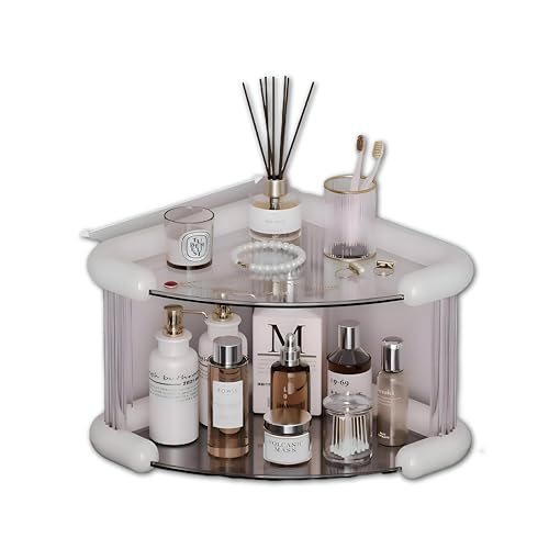 - The 2-level bathroom organizer is designed to give efficiency and order to your daily space. Its compact triangular shape makes it convenient to place on the table, wardrobe or even desk, creating a stylish balance between practicality and beauty in everyday organization.