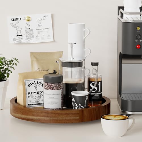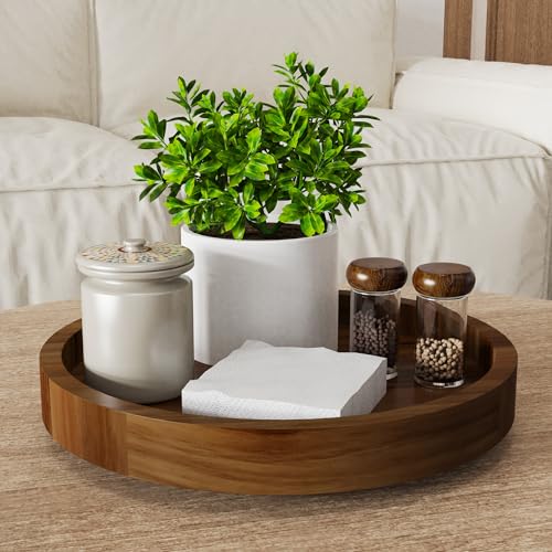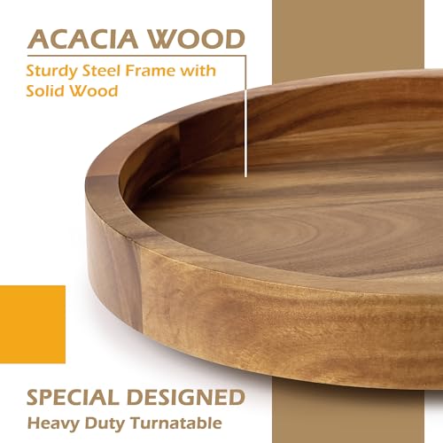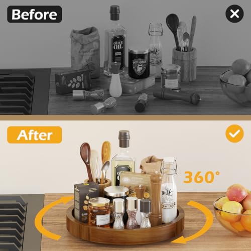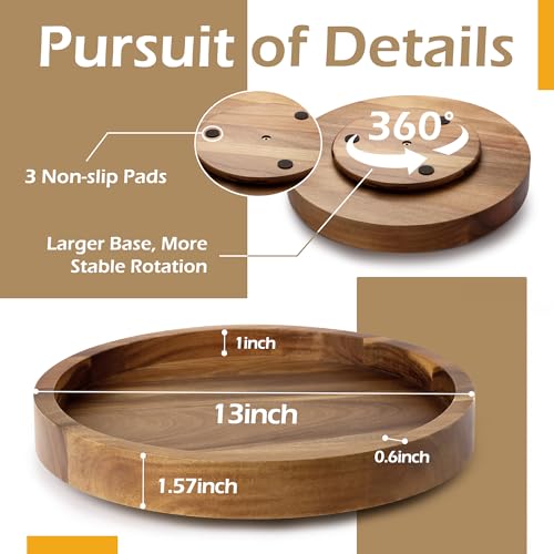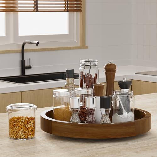 - Organized and Tidy Kitchen: This acacia wood lazy susan organizer measures 13" diameter x 1.57" height. Featuring a smooth 360 degree rotating design, this spice organizer can store and organize baking supplies, condiments, sauce and spice jars on the kitchen countertop, to keep kitchen gadgets accessible and orderly, so you can quickly find what you need when cooking. This turntable organizer also can display decorations on your dining table for gatherings with family and friends.