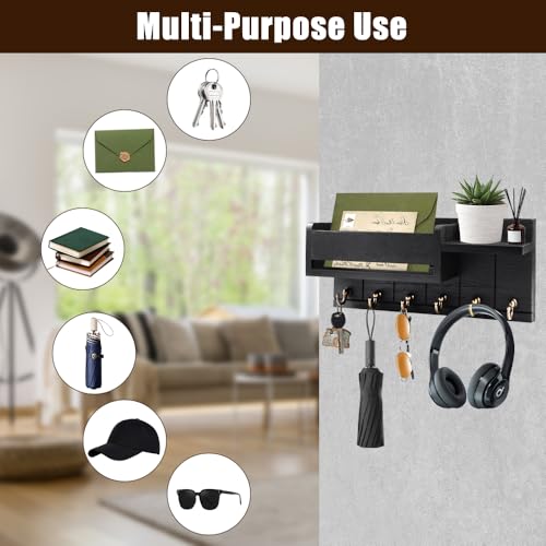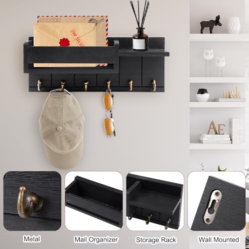 Orixo - Key Holder with Shelf, Wall Key Holder with 6 Hooks, Wooden Wall Key Holder for Envelopes, Books, Potted Plants, Perfumes, Hanging Keys, Clothes, Bags (Black)