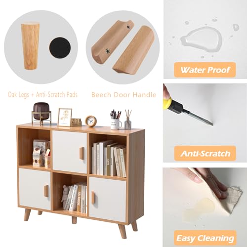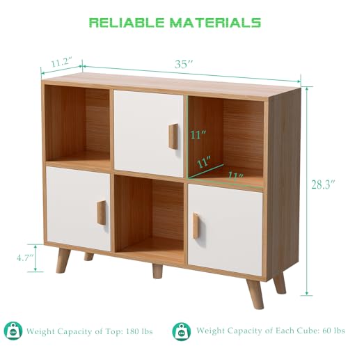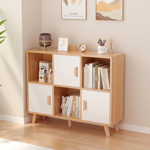 OSCHF - Cubby Shelf Bookcase with Doors - Wooden 6 Cube Floor Standing Open Bookshelf with Solid Wood Legs, 2-Tier Low Storage Cabinet, Oak and Warm White