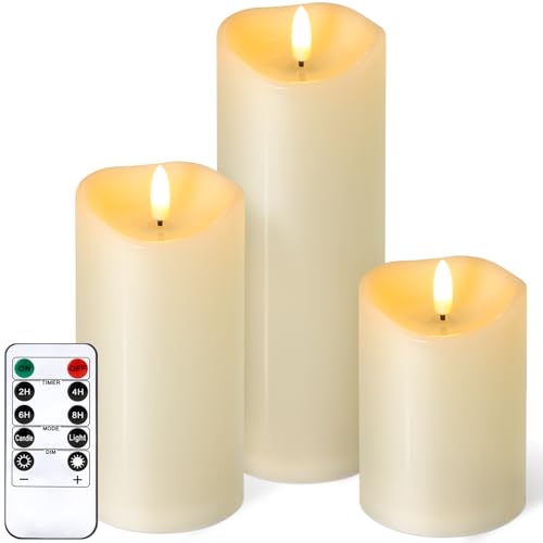NURADA - شموع خارجية بدون لهب مع مؤقت عن بعد - شمعة LED وامضة واقعية مقاومة للماء تعمل بالبطارية لديكور المنزل وحفلات الزفاف - عاجي 3 قطع (عمق 3 انش ارتفاع 4 انش 6 انش 8 انش)