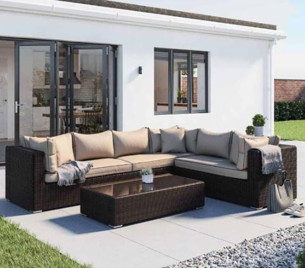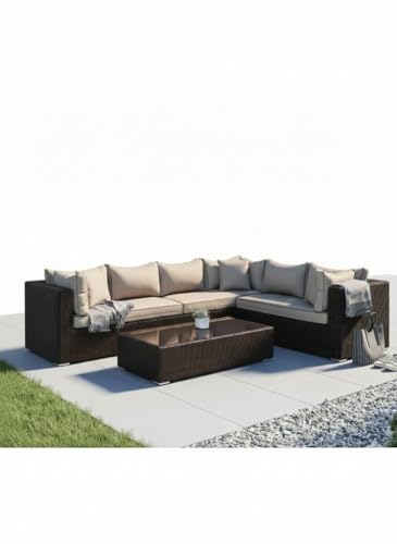 - COMPLETE SET: Includes L-shaped corner sofa and matching coffee table (60x100 cm, 35 cm height) perfect for serving refreshments and outdoor entertaining.