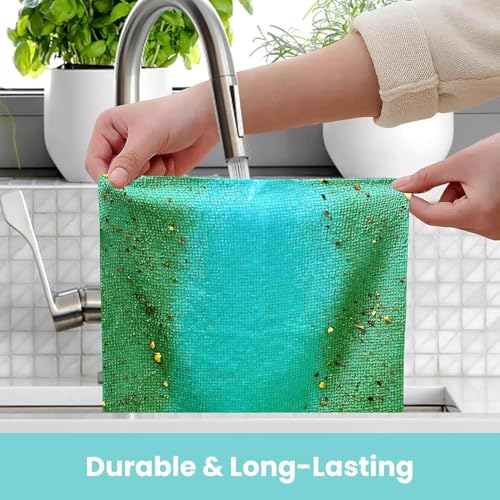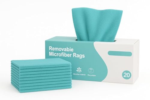 Outlay Home - قطعة قماش تنظيف من المايكروفايبر، 20 قطعة قماش بلون ازرق مخضر قابلة لاعادة الاستخدام مع صندوق موزع، تنظيف متعدد الاسطح للمطبخ وداخل السيارة وادوات المائدة والبقع والحنفيات والمرايا والزجاج