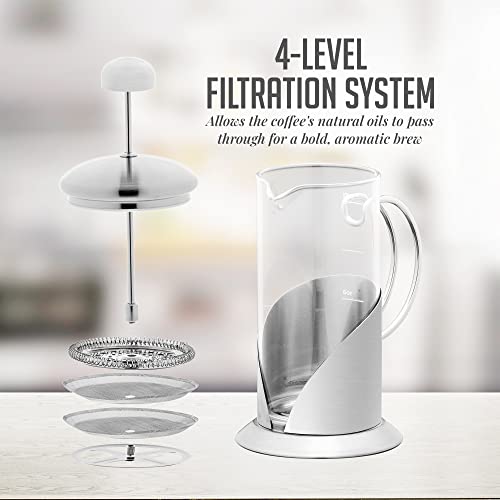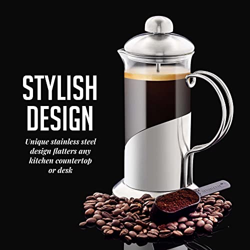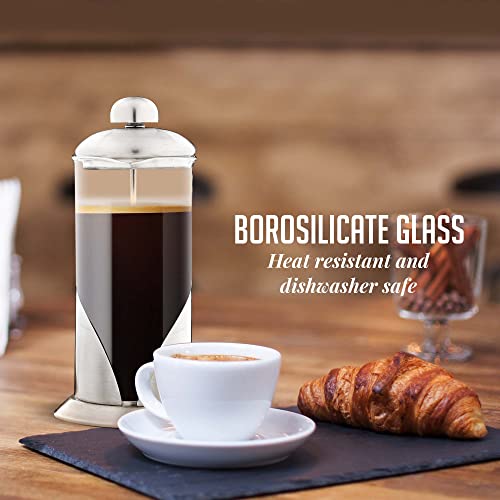 OVENTE - صانع قهوة وشاي واسبريسو مكبس فرنسي مع فلتر ثلاثي ومكبس فولاذ مقاوم للصدأ وإبريق من زجاج البورسليكات المقاوم للحرارة ومغرفة قياس مجانية من اوفينتي، فضي، FSL12S، سعة 1 لتر
