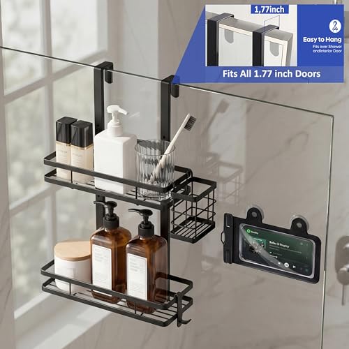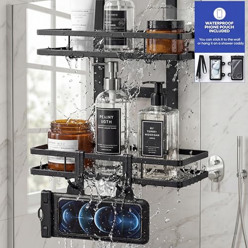 WEYALLE - Over the Door Shower Caddy Hanging, Rustproof Shower Shelves with Waterproof Phone Pouch, 2-Tier Adjustable Bathroom Organizers and Storage, No Drilling Shower Shelf, Black Shampoo Soap Holder