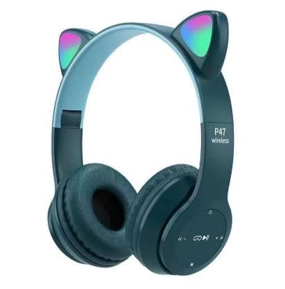 Generic - سماعات رأس لاسلكية بتصميم أذن قطة P47، بلوتوث، بإضاءة LED، تغطي الأذن بالكامل، قابلة للطي، سماعة رأس للألعاب والموسيقى (ازرق)