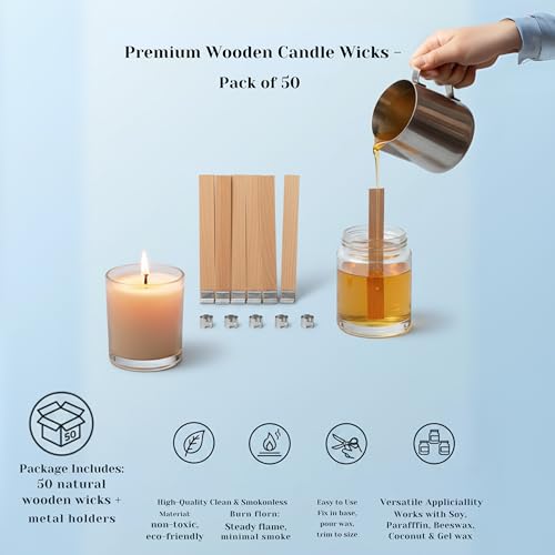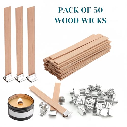 - محتويات العبوة: تحتوي المجموعة على 50 فتيل خشبي فاخر مع عروات معدنية، وهي مثالية للاستخدام في مشاريع صنع الشموع اليدوية.