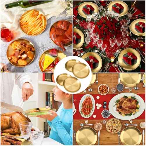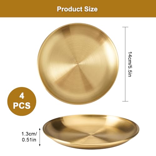 - Set of round golden trays: the set contains 4 saucers round golden stainless steel, easy to clean and dishwasher safe. The size of the golden plates is: diameter 14 cm/5.5 inches, height: 1.3 cm/0.51 inches, portable size for outdoor use, ideal for camping, picnic.