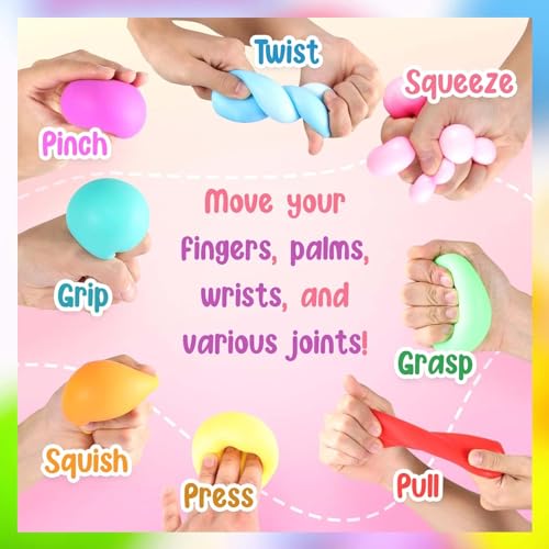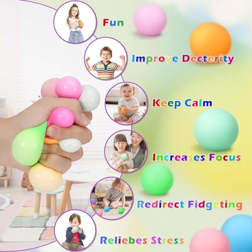 - Multifunctional: it is an ideal birthday gift. Stress ball children help children recognise sensory colours, improve mental thinking and coordination of hands and feet, develop their imagination and fitness. The ball is also great as a hand training ball for computer users or people who work a lot with their hands. Squeezing the balls stimulates muscles and tendons, which can relieve the pain caused by carpal tunnel syndrome.